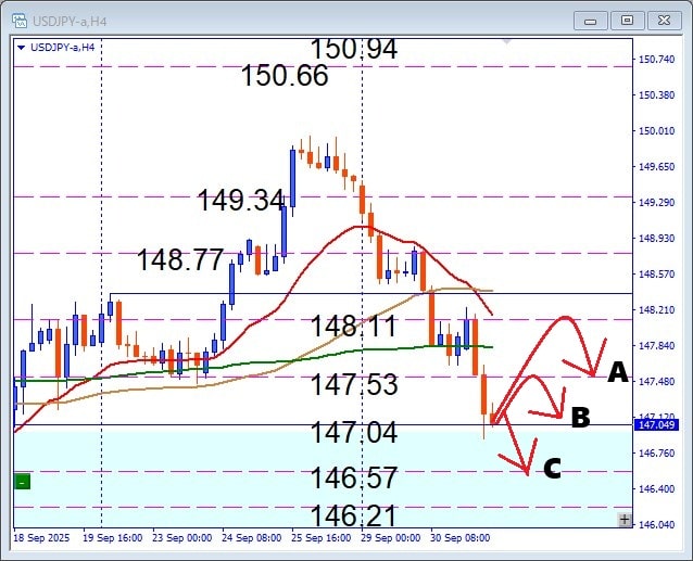 FXブレイク2025.10.01USDJPY 急落どこまで、戻り売りで狙うデイトレード戦略 ポスト シェア はてブ 送る Pocket USDJPY 急落どこまで!? 戻り売りで狙うデイトレード戦略 今日の注目通貨 USDJPY USDJPY 10月1日 USDJPYは、急落続行の動き A 148.11レジスタンス付近からの戻り売り狙い B 147.53レジスタンス付近からの戻り売り狙い C 147.00サポートブレイク狙い