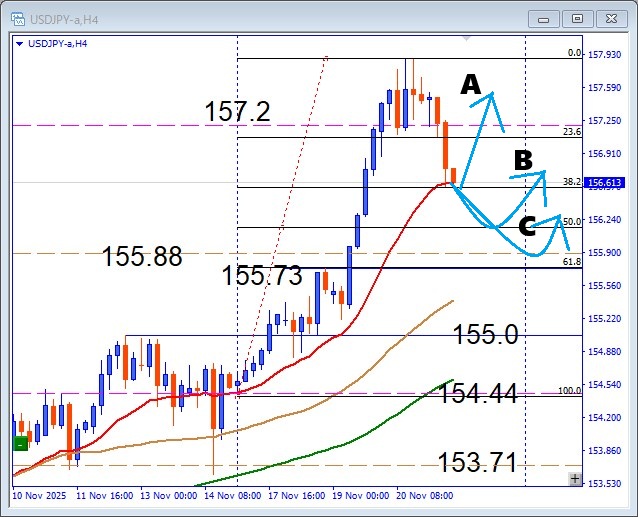 FXブレイク2025.11.21USDJPY 深めの調整は押し目買い好機?円安の流れをデイトレで攻略! ポスト シェア はてブ 送る Pocket USDJPY 深めの調整は押し目買い好機?円安の流れをデイトレで攻略! 今日の注目通貨 USDJPY USDJPY 11月21日 USDJPYは、調整の動き。どこで下げ止まるのか? A フィボサポート付近からの押し目買い狙い B フィボ半値戻し付近からの押し目買い狙い C 155.88サポート付近からの押し目買い狙い