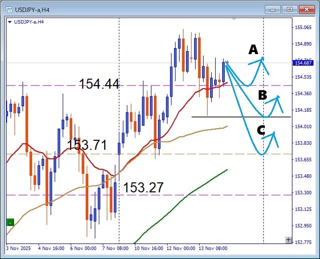 FXブレイク2025.11.14円安の勢い止まらず!USDJPY 押し目買いでレジスタンスアタック突破を狙う! ポスト シェア はてブ 送る Pocket 円安の勢い止まらず!USDJPY 押し目買いでレジスタンスアタック突破を狙う! 今日の注目通貨 USDJPY USDJPY 11月14日 USDJPYは、やっぱり中途半端な位置で折り返しの動き。 A 154.44サポート付近からの押し目買い狙い B 154.12サポート付近からの押し目買い狙い C 153.71サポート付近からの押し目買い狙い