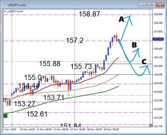 FXブレイク2025.11.20円安の追い風、USDJPY 押し目買い戦略とレジスタンスアタックの鍵は米国雇用統計 ポスト シェア はてブ 送る Pocket 円安の追い風、USDJPY 押し目買い戦略とレジスタンスアタックの鍵は米国雇用統計 今日の注目通貨 USDJPY USDJPY 11月20日 USDJPYは、押し目なしで上昇の動きでした。 A 直近高値ブレイク狙い B 155.88サポート付近からの押し目買い狙い C 155.0サポート付近からの押し目買い狙い